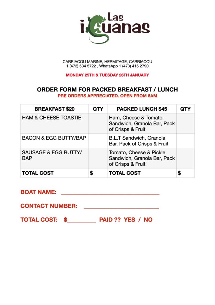 Pre-Order Food Please order for Race Day’s using WhatsApp Number or Email Provided the NIGHT BEFORE, before 8pm. Sunday 25 January: Pre-order for Monday 26th at Las Iguanas Bar & Cafe via Whatsapp +1 473 534-5722 Click to view large food order form Monday 26 January: Pre-order for Tuesday 27 at Las Iguanas Bar & Cafe via Whatsapp +1 473 534-5722 Click to view large food order form Wednesday 28 January: Pre-order for Thursday 29 at Asian Cafe, Le Phare Bleu Marina via Whatsapp +1 473 403-2683 Click to view large food order form Wednesday 28 January: Pre-order for Thursday 29 at Asian Cafe, Le Phare Bleu Marina via Whatsapp +1 473 403-2683 Click to view large food order form Thursday 29 January : Pre-order for Friday 30 at Victory Bar & Restaurant via email [email protected] Click to view large food order form